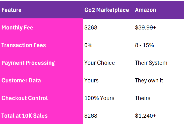If you make just $2,500 in monthly sales, you’re already saving money compared to traditional marketplaces. Plus you keep customer relationships and business control.